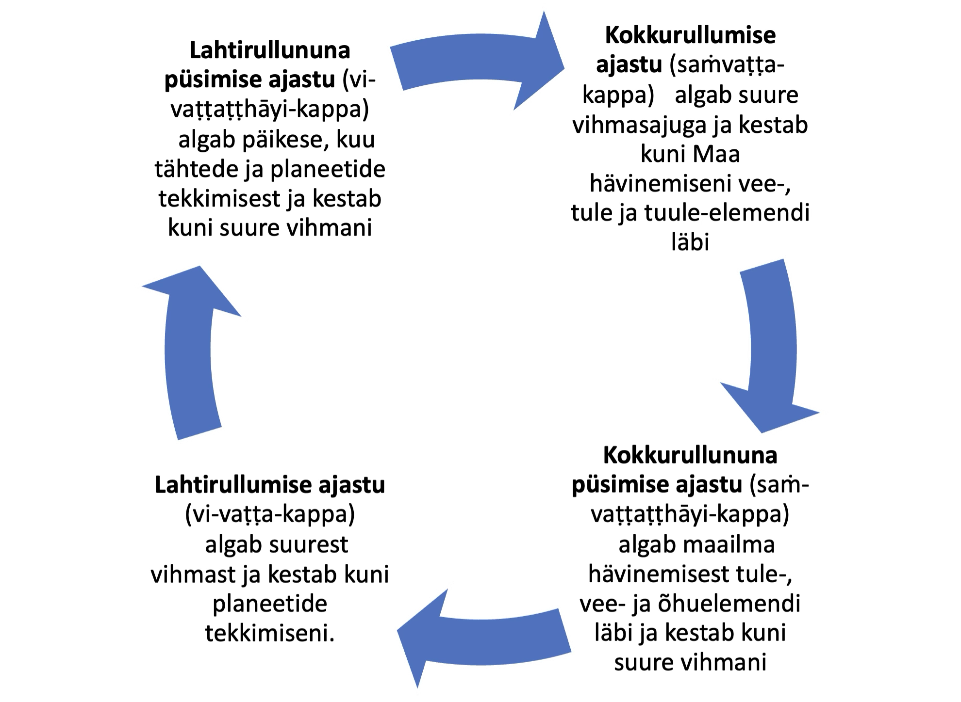 Kokkurullumise ajastu (saṁ-vaṭṭa-kappa) algab suure vihmaga ja kestab kuni Maa hävinemiseni vee-elemendi ehk uputuste, tuleelemendi ehk tulekahjude ja tuule-elemendi ehk tormide läbi. Kokkurullununa püsimise ajastu (saṁ-vaṭṭaṭṭhāyi-kappa) algab maailma hävinemisest tule-, vee- ja õhuelemendi läbi ja kestab kuni suure vihmani, mis kuulutab uue maailma algust (ehk evolutsiooni). Lahtirullumise/laialivalgumise ajastu (vi-vaṭṭa-kappa) algab suurest vihmast ja kestab kuni päikese, kuu jt planeetide tekkimiseni. Lahtirullununa püsimise ajastu (vi-vaṭṭaṭṭhāyi-kappa) algab päikese, kuu jt tähtede ning planeetide tekkimisest ja kestab kuni suure vihmani, mis mis kuulutab maailma kokkurullumise ajastu (ehk devolutsiooni, universumi kokkutõmbumise) (saṁ-vaṭṭa-kappa) algust.[6]